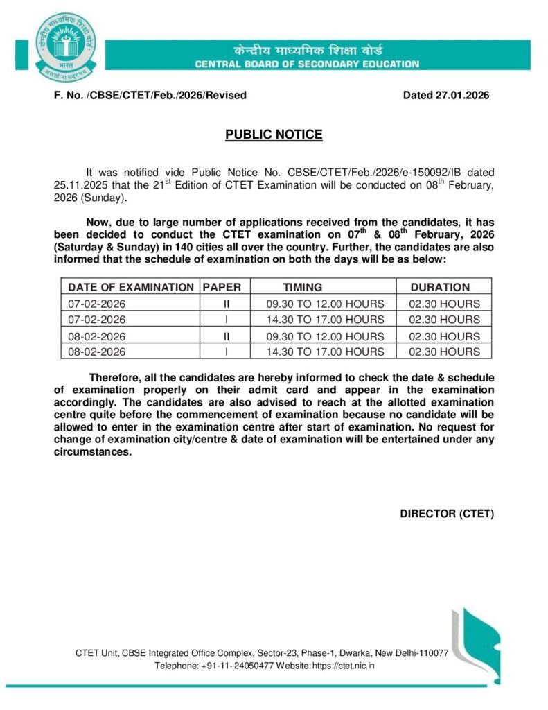 केंद्रीय माध्यमिक शिक्षा बोर्ड (CBSE) द्वारा आयोजित केंद्रीय शिक्षक पात्रता परीक्षा (CTET) फरवरी 2026 को लेकर एक महत्वपूर्ण आधिकारिक सूचना जारी की गई है। बोर्ड ने स्पष्ट किया है कि CTET 2026 (21st Edition) की परीक्षा 07 और 08 फरवरी 2026 को सफलतापूर्वक आयोजित की गई थी, लेकिन प्रशासनिक कारणों से कुछ निर्धारित परीक्षा केंद्रों […]